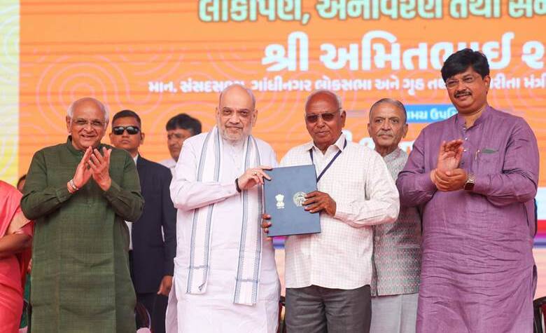 Amit Shah distributes land allotment certificates to 205 families of Nava Vanjar village in Ahmedabad, Gujarat