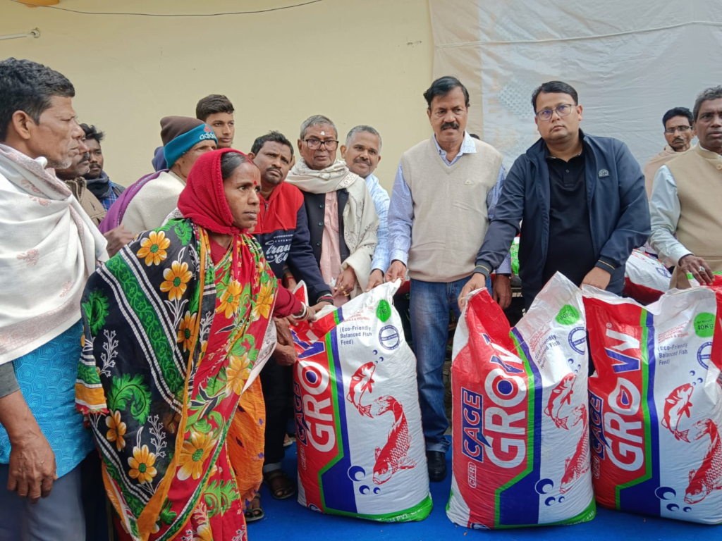 Under the programme, 300 SC fish farmers from different Gram Panchayats of the Sagar Community Development Block were benefited. Each beneficiary received 6 kg of Indian Major Carp (IMC) fingerlings and 80 kg of fish feed for backyard pond fish culture demonstrations. The initiative targets households owning small ponds ranging from 0.02 to 0.04 hectares, enabling supplementary income generation and improved family nutrition without affecting household responsibilities.