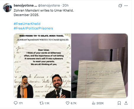 New York, New Delhi’ January 2026: After newly sworn in Mayor of New York Zohran Mamdani wrote a letter of support to Umar Khalid, an accused in the North East Delhi riots larger Conspiracy case, eight U.S. lawmakers have now written a letter urging the Indian Government to grant Khalid a fair trial as per international law.