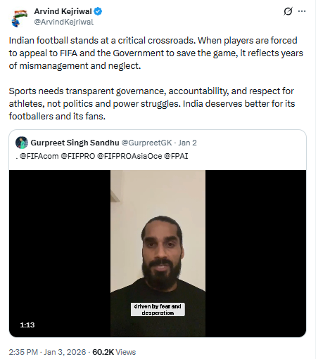 On this entire issue, Aam Aadmi Party national convenor Arvind Kejriwal has raised his voice openly. In a tweet, he said that Indian football today stands at a critical crossroads, where if the right and honest decisions are not taken even now, the sport will head towards complete destruction in the coming years. When players are forced to appeal to FIFA and the government to save the game, it is the result of years of mismanagement and neglect. He clearly stated that sports need transparent governance, accountability and respect for players — not politics and power struggles.