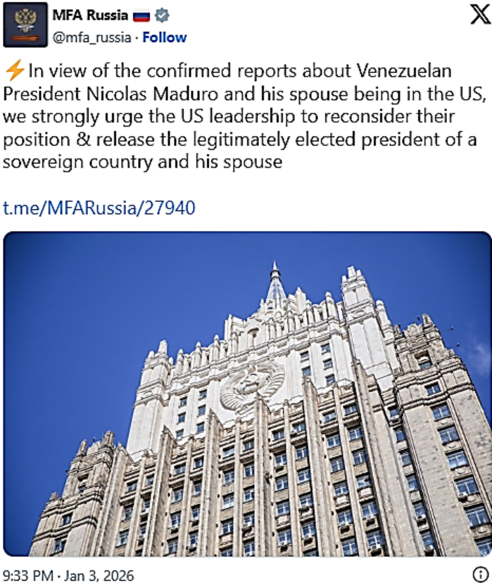 In a post on X, the Russian MFA shared, “In view of the confirmed reports about Venezuelan President Nicolas Maduro and his spouse being in the United States, we strongly urge the US leadership to reconsider their position and release the legitimately elected president of a sovereign country and his spouse”.
