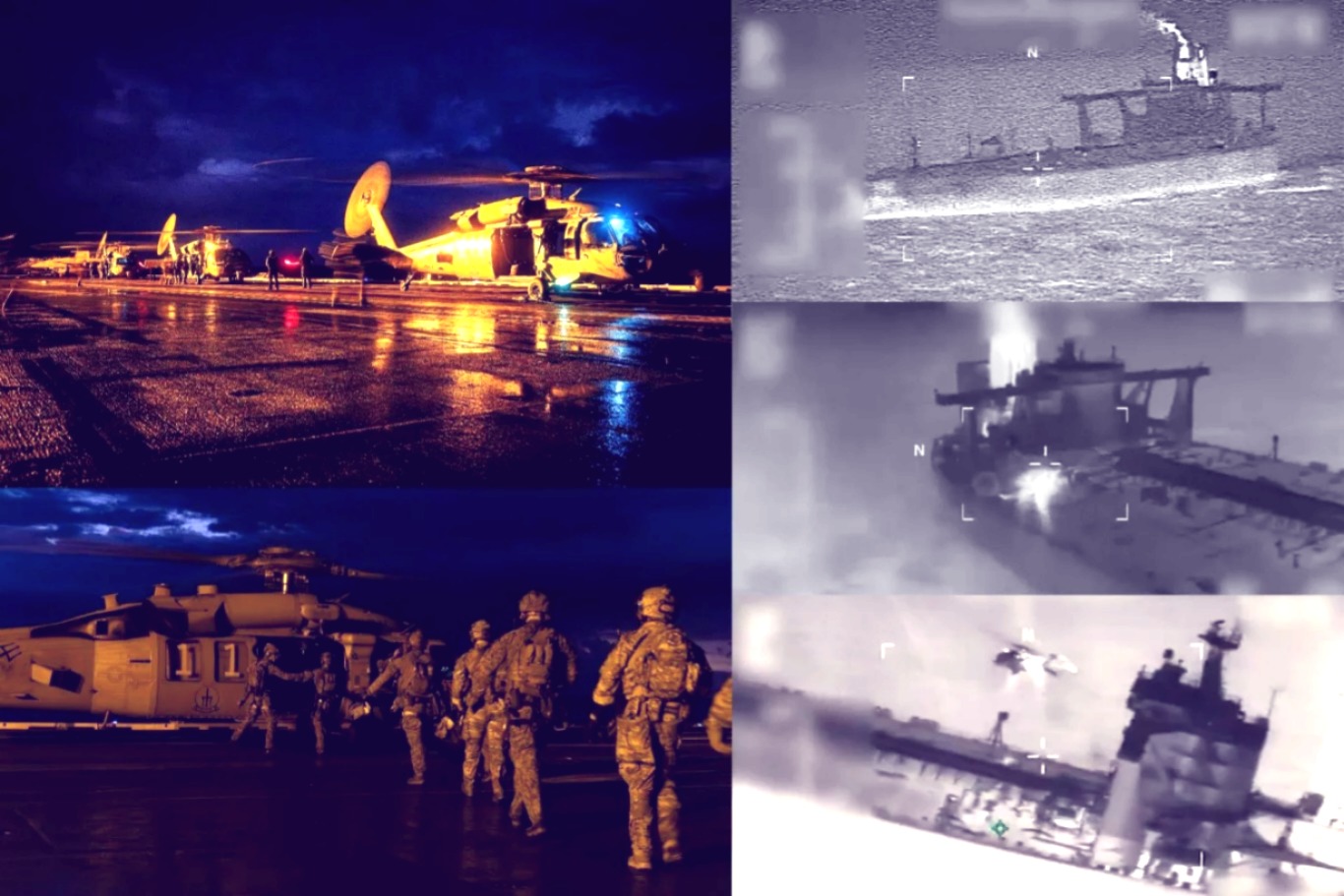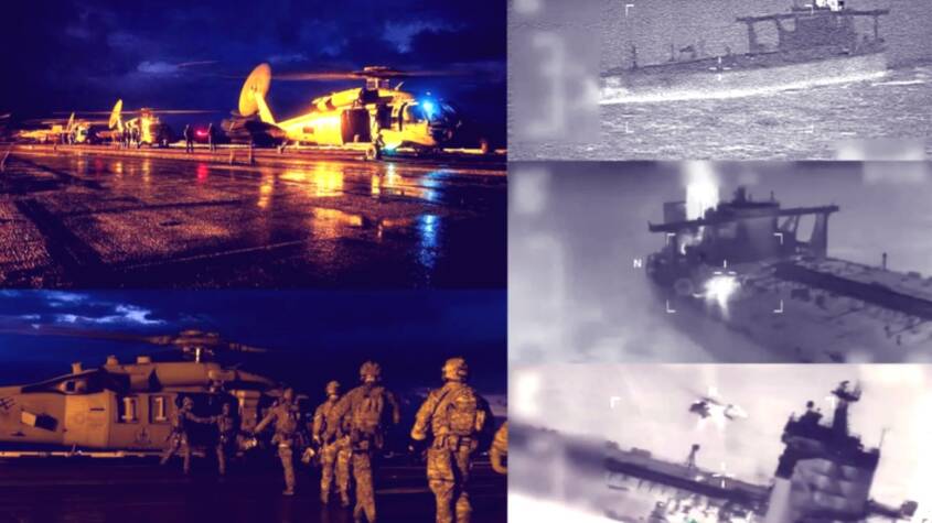 Complementing these still photographs, video released by the Secretary of Homeland Security and re-posted by U.S. Southern Command shows the decisive phase of the seizure. A twin-engine helicopter approaches the deck of the fully laden tanker at night, then hovers or briefly lands near the centreline. A small assault team in dark uniforms disembarks and moves rapidly toward the superstructure, securing stairways leading to the bridge and other key access points. Subsequent frames show the boarding force fanning out along the deck to clear the area before entering the vessel, closely following established visit, board, search and seizure procedures for large non-compliant ships.