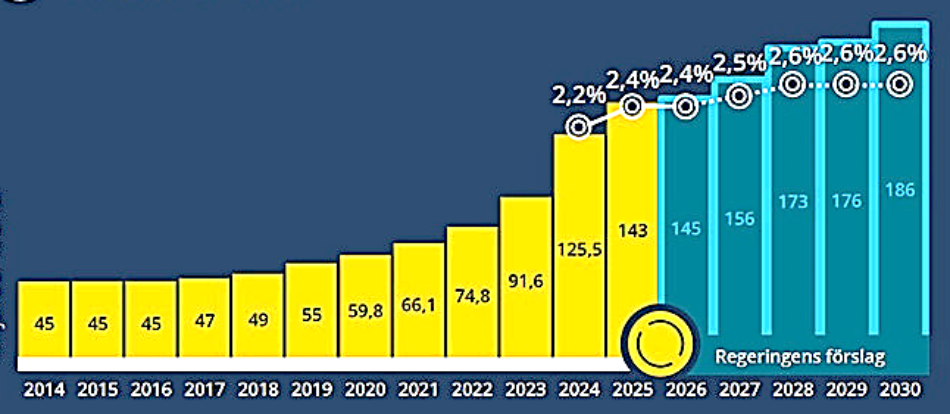 The most powerful reinforcement of the total defence since the Cold War is now being implemented. Sweden is rapidly arming itself in an international context and is making major investments in both civil and military defence. Military defence will receive an increase of over 170 billion and civil defence over 37.5 billion by 2030. Military defence spending will amount to 2.6 percent of GDP in 2028. A powerful Swedish total defence strengthens both Sweden’s and NATO’s security.