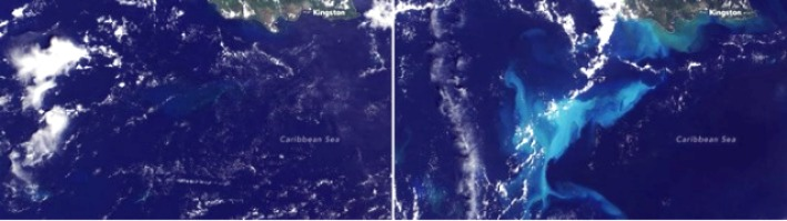 Pedro Bank is deep enough that it is only faintly visible in natural color satellite images most of the time. However, with enough disruption from hurricanes or strong cold fronts, its existence becomes more evident to satellites. Suspended calcium carbonate (CaCO3) mud, consisting primarily of remnants of marine organisms that live on the plateau, turns the water a Maya blue color. The appearance of this type of material contrasts with the greenish-brown color of sediment carried out to sea by swollen rivers on Jamaica’s southern coast.