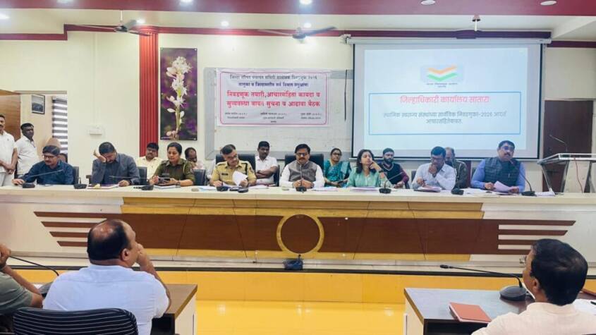 A review meeting on the preparations for the District Council and Panchayat Committee elections, implementation of the model code of conduct, and law and order measures was held at the Planning Bhavan of the District Collector’s office. Present at the meeting were Chief Executive Officer Yashani Nagarajan, Superintendent of Police Tushar Doshi, Superintending Engineer of the Water Resources Department Abhay Katkar, Superintending Engineer of the Public Works Department Santosh Rokade, Additional Superintendent of Police Vaishali Kadukar, Sub-Divisional Officer (Revenue) Vikrant Chavan, and Resident Deputy Collector Nagesh Patil, among others.