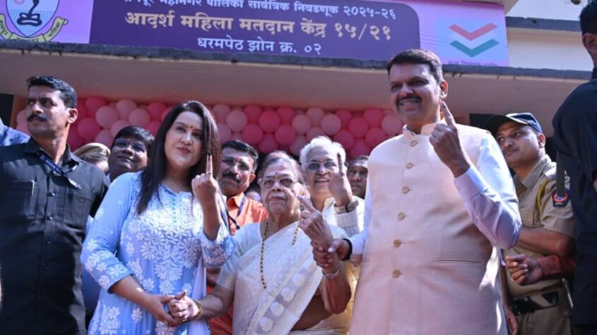 The Chief Minister voted at the model women’s polling station set up at the Dharampeth Hindi Upper Primary School on VIP Road in the Dharampeth area. He was accompanied by his mother, Sarita Fadnavis, and his wife, Amruta Fadnavis, while casting his vote.