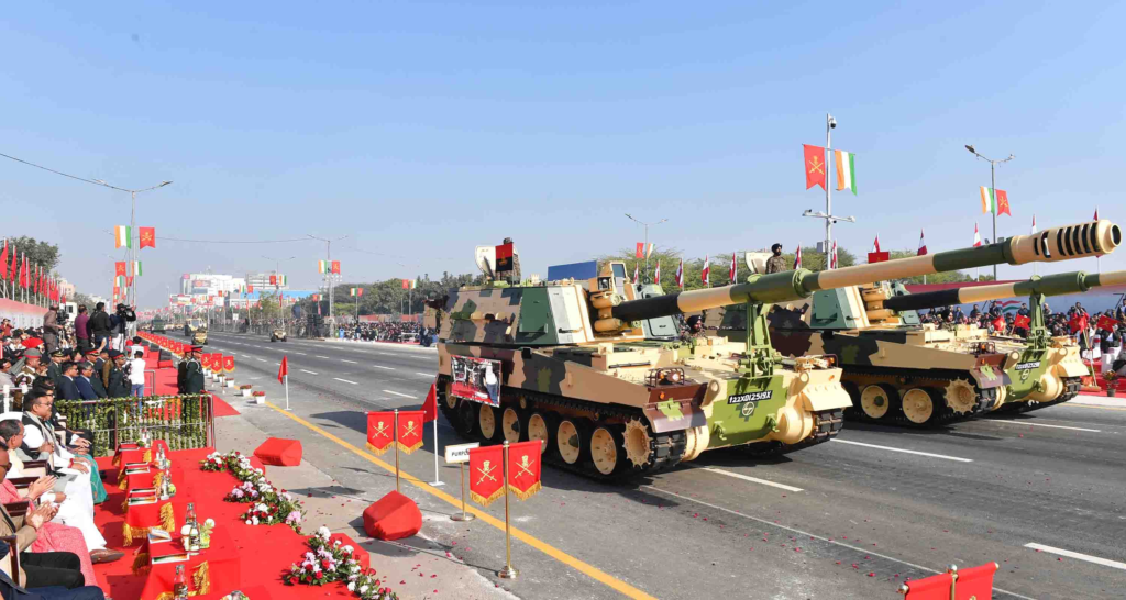 Major attractions included displays of indigenous BrahMos missiles, Bhishma and Arjun tanks, K-9 Vajra artillery guns, BMP vehicles, 155 mm Amogh, NAMIS (Nag Missile System), Pinaka rocket launcher system, Shilka weapon system, drone power, drone jammer technology and electric all-terrain vehicles. March-past contingents from seven Indian Army regiments, including the newly raised Bhairav Battalion, participated in the parade.