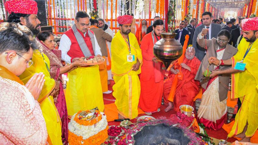 On this occasion, Governor Shri Haribhau Bagde and Chief Minister Shri Bhajanlal Sharma were also present. The President performed special prayers during the Mahayagya and wished for the peace, prosperity, and well-being of the nation and the state, along with global welfare. After the ritual, the President, Governor, and Chief Minister circumambulated the yajna site. The President also met Jagadguru Swami Rambhadracharya Ji and extended her greetings and respects.