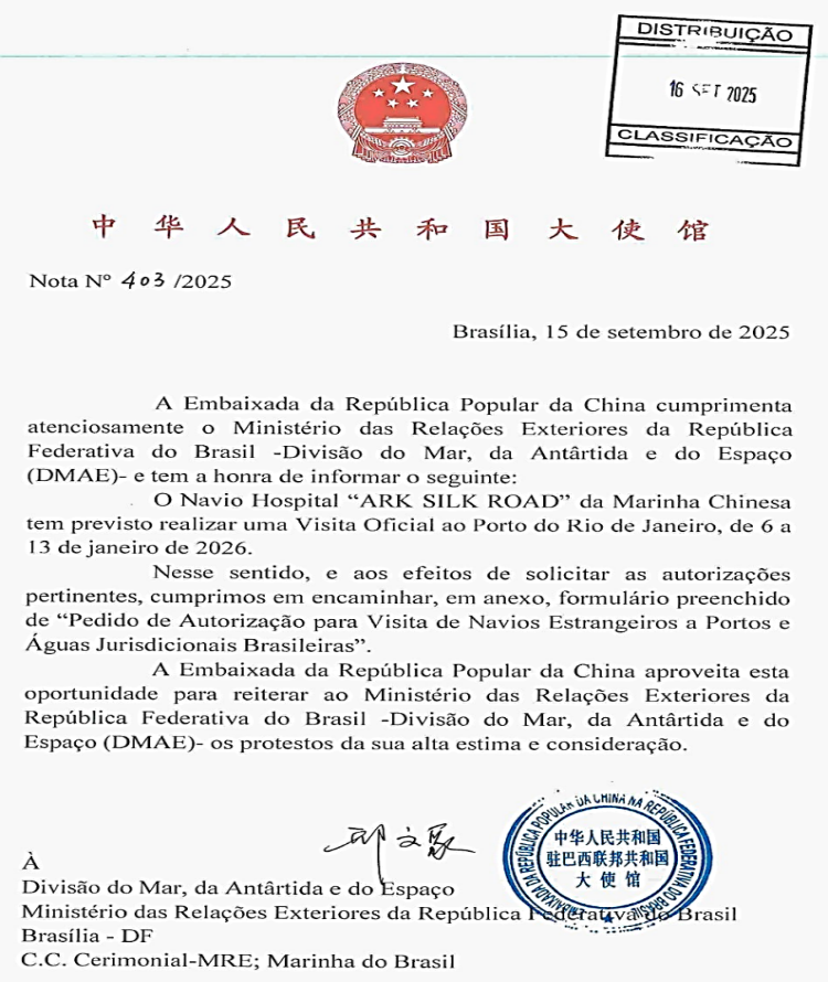 When a section of the media personnel had approached the relevant Brazilian authorities, the Ministry of Foreign Affairs recommended that questions be directed to the Brazilian Navy and the Chinese embassy in Brazil. Meanwhile, the Navy stated that it is only responsible for the technical and logistical aspects of the request. The Chinese embassy did not respond. The Brazilian Ministry of Defence, pointed back to the Foreign Ministry. Documents obtained through the Access to Information Act confirm that official messages were exchanged only between the Ministry of Foreign Affairs and the Navy.
