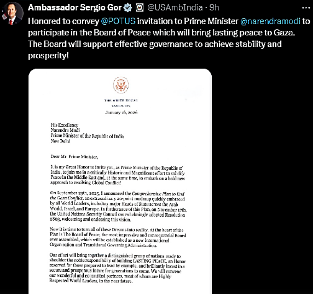 New Delhi; January 2026: US Ambassador to India, Sergio Gor, shared President Donald Trump’s invitation letter to Prime Minister Narendra Modi to be a part of the Gaza Board of Peace. According to Sergio Gor, President Trump has sent a letter to Modi, which Gor has shared on social media, on 18th January around 22:30 hours.