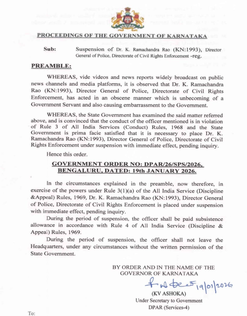 “The videos and news reports widely broadcast on public news channels and media platforms indicate that Dr K. Ramachandra Rao, DGP, Directorate of Civil Rights Enforcement (DCRE), has acted in an obscene manner, causing embarrassment to the government,” the order noted. It added that the seriousness of the allegations warranted immediate suspension to ensure a fair and impartial inquiry.