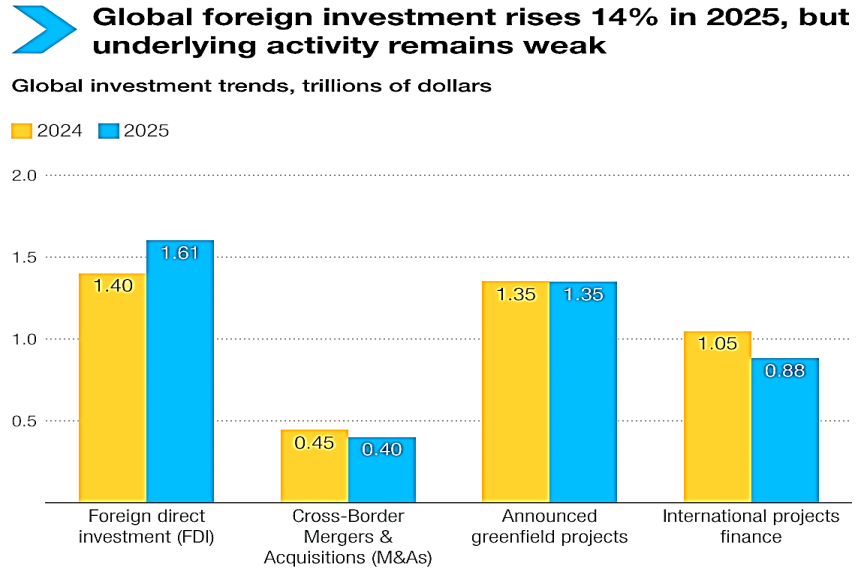 January 2026: Global foreign direct investment (FDI) increased by 14% in 2025 to an estimated $1.6 trillion, according to UN Trade and Development (UNCTAD) in its the latest Global Investment Trends Monitor.
