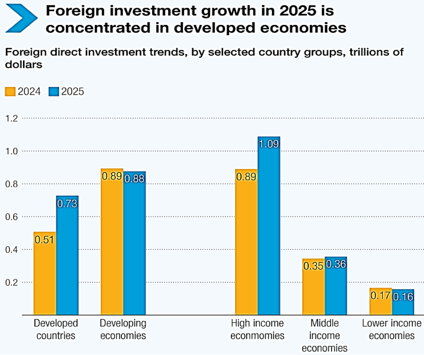 More than $140 billion of the increase came from higher flows through global financial centres. Excluding these conduit flows, global Foreign Direct Investments (FDI) rose by only about 5%, highlighting how limited the recovery remains in underlying investment.