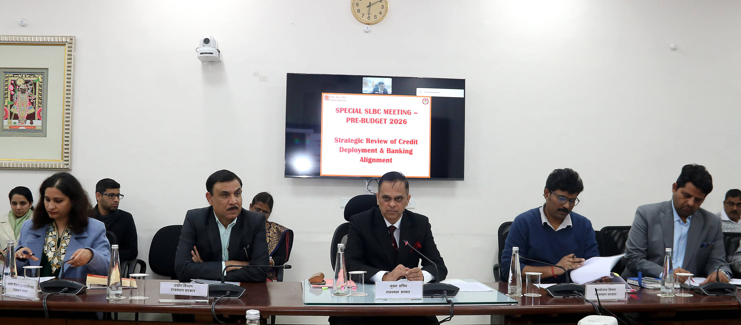 The Bank of Baroda presented on loan distribution frameworks and expansion strategies in Rajasthan. Representatives from RBI, NABARD, SBI, PNB, HDFC, ICICI, IDBI, Bank of India, Indian Bank, Bank of Maharashtra, and other major banks participated in the discussion.