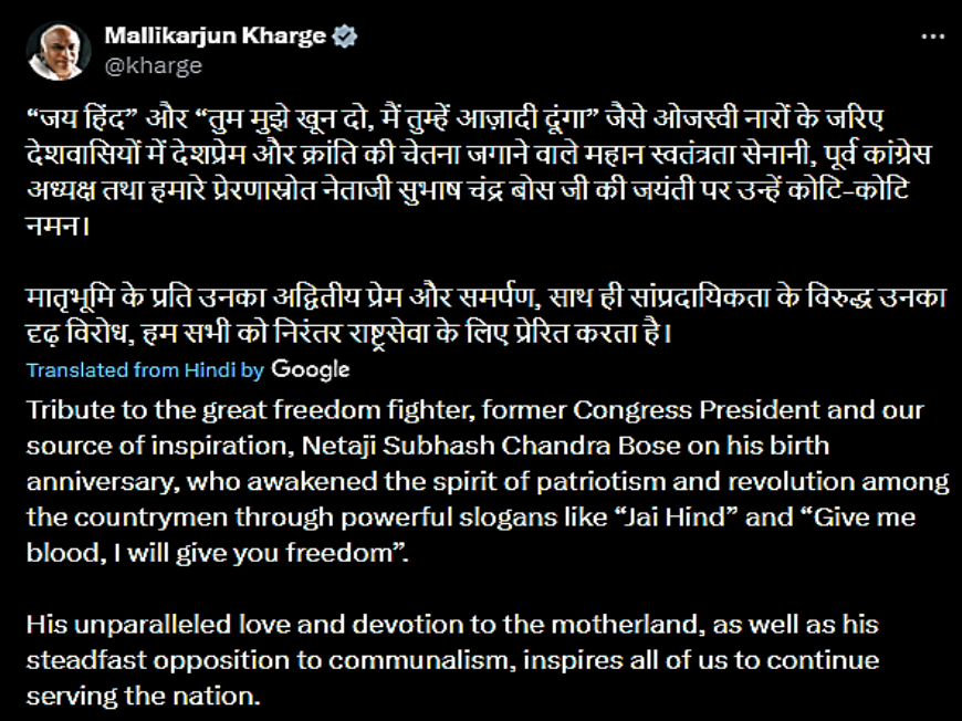 Congress President Mallikarjun Kharge today morning paid tribute to Netaji Subhas Chandra Bose on his 129th birth anniversary, saying his unparalleled love for the motherland and dedication to serving the nation continue to inspire everyone. He also praised his role in awakening patriotism and a revolutionary spirit among Indians through slogans like “Jai Hind” and “Tum mujhe khoon do, main tumhe azaadi doonga”.