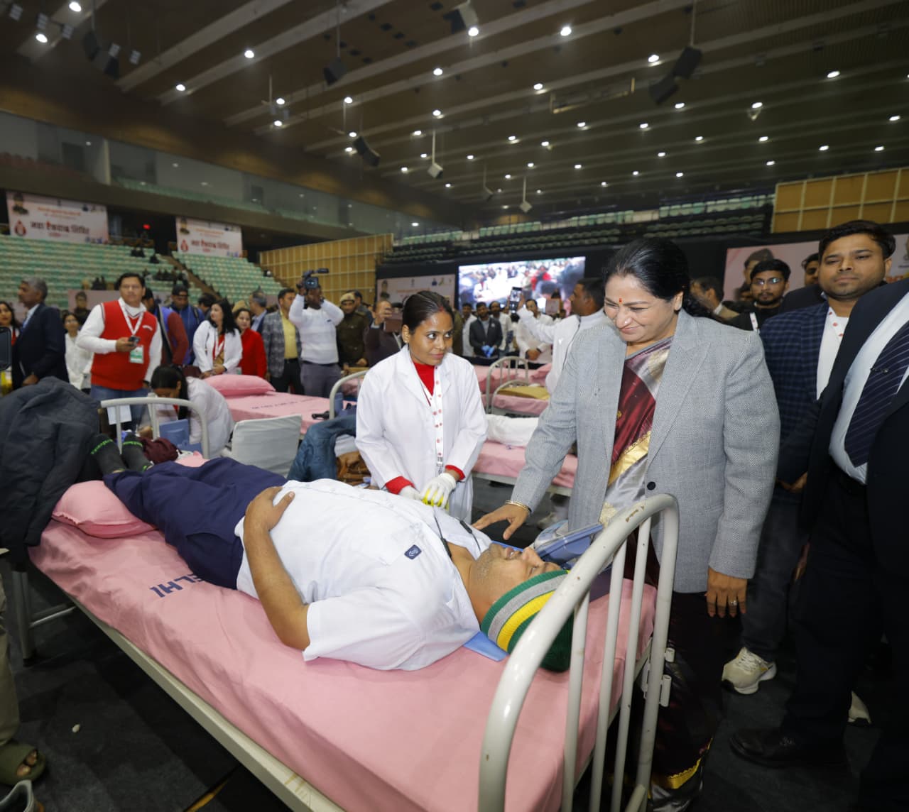CM Rekha Gupta boosts the morale of blood donors at Thyagaraj Stadium