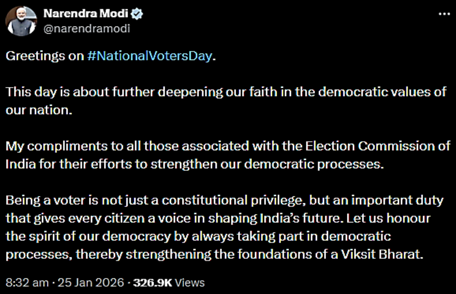 In a post shared on X, the Prime Minister said National Voters’ Day is an opportunity to deepen faith in the democratic values of the nation. He also complimented the Election Commission of India for its sustained efforts to strengthen democratic processes across the country. PM Modi’s X post read: