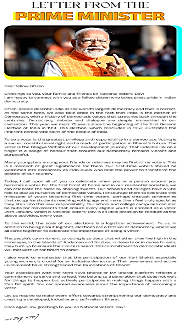 Highlighting the importance of celebrating voter enrolment, the Prime Minister also wrote a letter to MY Bharat volunteers, urging them to rejoice when someone around them enrols as a voter for the first time. In his letter, PM Modi described Indian democracy as both the world’s largest democracy and the “Mother of Democracy’, rooted in centuries-old traditions of debate and dialogue. He recalled that India is marking 75 years since the beginning of its first General Election in 1951, which, he said, reflected the inherent democratic spirit of the people.