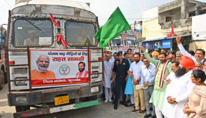 CM Nayab Singh Saini flags off 20 relief material trucks from Pipli grain market for Punjab